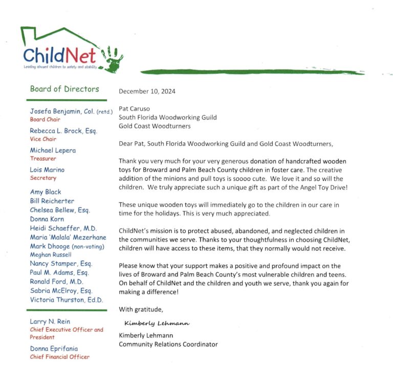1. Toys for children are built annually and provided to those in need in our community through the Child Net organization.